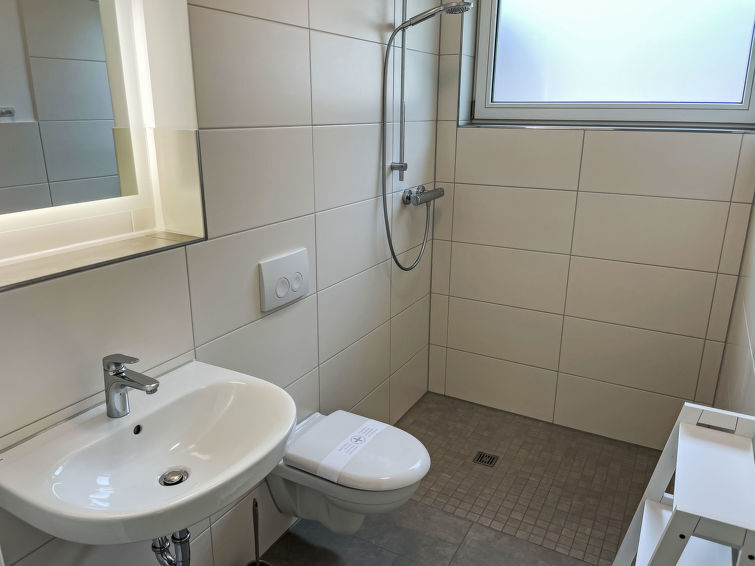3-Zimmer-Wohnung 58 m2, im Erdgeschoss. Komfortabel und modern eingerichtet: grosses Wohn-/Esszimmer mit Sat-TV (Flachbildschirm). Ausgang zur Terrasse. 1 Zimmer mit 1 Doppelbett (180 cm, Länge 200 cm). 1 Zimmer mit 2 Betten (90 cm, Länge 200 cm). Offene Küche (Backofen, Geschirrspüler, 4 Glaskeramikplatten, Toaster, Wasserkocher, elektrische Kaffeemaschine). Dusche/WC. Heizung. Terrassenmöbel, Liegestühle. Sehr schöne Sicht auf den See. Zur Verfügung: Kinderhochstuhl. Internet (WLAN, gratis). Geeignet für Familien. Maximal 2 Haustiere/Hunde erlaubt.