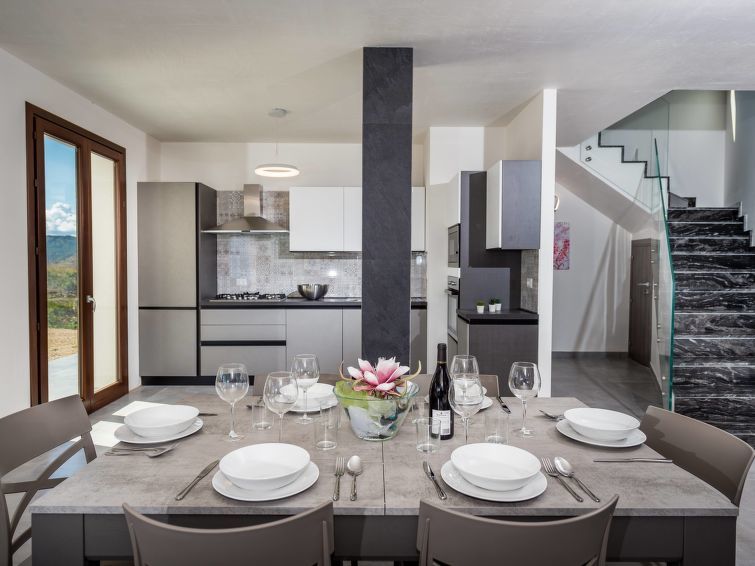 5-Zimmer-Villa 210 m2 auf 2 Stockwerken. Modern und geschmackvoll eingerichtet: grosses Wohn-/Esszimmer mit Panoramafenster mit TV (Flachbildschirm). Ausgang zur Terrasse. 1 Doppelzimmer mit Panoramafenster mit Dusche/Bidet/WC, Klimaanlage und Warmluftheizung. Ausgang zur Terrasse. Kochnische (5 Kochplatten, Geschirrspüler, Toaster, Wasserkocher, Mikrowelle). Dusche/Bidet/WC. Obergeschoss: 1 Doppelzimmer mit Dusche/Bidet/WC und TV (Flachbildschirm), Klimaanlage und Warmluftheizung. Ausgang zur Terrasse. 2 Doppelzimmer, jedes Zimmer mit Klimaanlage und Warmluftheizung. Dusche/Bidet/WC. Heizung, Klimaanlage, Warmluftheizung. Heizung nur verfügbar von 01.12. bis 31.03, Heizung nicht in allen Räumen. 2 grosse Terrassen 30 m2, überdacht, Nordostlage Terrasse 15 m2, Nordostlage. Terrassenmöbel, Gartengrill, Liegestühle. Sehr schöne Panoramasicht auf das Meer, die Berge und das Schwimmbad. Zur Verfügung: Waschmaschine, Bügeleisen, Kinderhochstuhl, Babybett bis 2 Jahre, Haartrockner. Internet (Wireless LAN, gratis). Parkplatz (3 Autos). Bitte beachten: Rauchmelder, Feuerlöscher. IT081005C22WSQURZ7