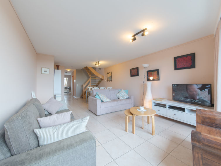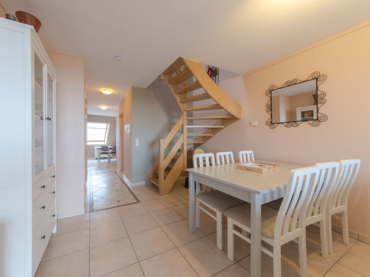 "Meiboom 503", appartement 3-kamers 120 m2 op 2 verdiepingen op de 5e verdieping. Ruim, doelmatig ingericht: open woon-/eetkamer met eettafel, TV en internationale TV-zenders (Flatscreen TV), DVD en elektrische verwarming. Keuken (afwasmachine, 4 keramische glas kookplaten, diepvriezer, elektrische koffiemachine, combimagnetron) met eettafel. Aparte WC. Elektrische verwarming. Bovenverdieping: 1 kamer met 1 bed (180 cm, lengte 200 cm). 1 kinderkamer met 1 x 2 stapelbedden (90 cm, lengte 200 cm). Bad/douche, aparte WC. Balkon 4 m2, op het noordwesten gelegen. Uitzicht op zee en De duinen. Ter beschikking: wasmachine, droger, kinderstoel, haardroger. Internet (Internet (WiFi), gratis). Garage nr. 10 (kleine wagen) (1 Auto) op 100 m. Rookmelders, brandblusser.
